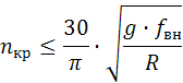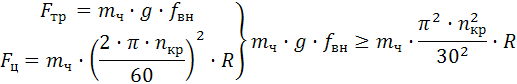 Критическое число оборотов nкр [об/мин] тарели, при которой сыпучий материал неконтролируемым образом начинает ссыпаться с нее, определяют исходя из условия равновесия частицы массой m под действием сил внешнего трения и центробежной силы: