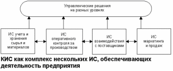 На любом предприятии или фирме в состав КИС должно входить несколько локальных ИС разного назначения, которые взаимодействуют между собой и поддерживают управленческие решения на всех уровнях. На рисунке показан один из таких вариантов.