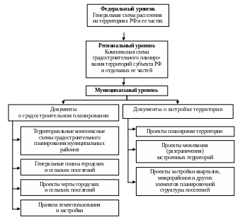 Проекты планировки разрабатываются для частей территорий городских и сельских поселений в соответствии с генеральным планом. Проекты межевания территорий разрабатываются для застроенных и подлежащих застройке территорий и служат основанием для установления границ земельных участков на местности. Проекты застройки территорий разрабатываются для территорий кварталов, микрорайонов и других элементов планировочной структуры городских и сельских поселений. В проектах застройки определяются, в частности, расположение зданий, строений и сооружений, этажность, тип и другие характеристики, архитектурное решение застройки, системы инженерного оборудования, связи и благоустройства, организация движения транспортных средств и пешеходов.