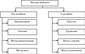 Метод квот – изначально выделяется некоторое количество групп объектов по определенным признакам (например, мужчины в возрасте 20-30 лет, 31-45 лет и 46-60 лет; или лица с доходом до 30 тысяч рублей, с доходом от 30 до 60 тысяч рублей и с доходом свыше 60 тысяч рублей). Внутри групп объекты отбираются произвольно.