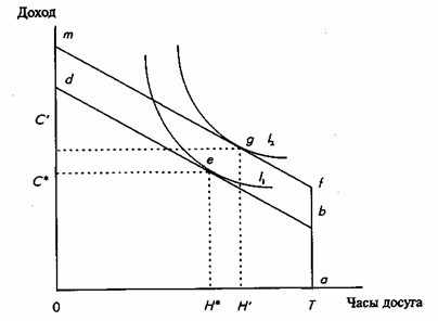Первое слагаемое правой части уравнения отражает воздействие эффекта замещения, второе слагаемое — влияние эффекта дохода. Как видно из уравнения, «вклад» эффекта дохода в совокупное воздействие изменения ставки заработной платы на предложение труда будет прямо пропорционален количеству часов работы. Когда досуг является нормальным благом, как это предполагается в модели предложения труда, эффекты дохода и замещения действуют в противоположных направлениях. Это означает, что отношение потребителя к досугу принципиально отличается от его отношения к другим благам, для которых, если благо нормальное, эффект дохода и эффект замещения действуют в одинаковом направлении. Такое отличие возникает из-за того, что увеличение цены досуга делает досуг относительно более дорогим, но одновременно увеличивает реальный доход, в то время как увеличение цены на другие товары делает их относительно более дорогими и снижает реальный доход.