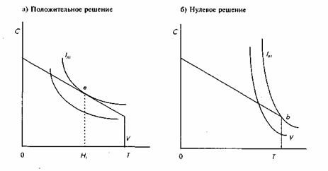 На рис. 1.2 для одних и тех же ставки заработной платы и нетрудового дохода изображены различные индивидуальные предпочтения двух человек. На рис. 1.2 а количество часов работы будет Н1 (индивидуальная кривая безразличия IА11 и линия бюджетных ограничений будет касаться в точке е, соответствующей Н1 часам работы), на рис. 1.2б количество часов работы будет нулевым, Н = 0 (индивидуальная кривая безразличия IВ1 касается линии бюджетных ограничений в точке b, соответствующей нулевым часам работы.). Ситуация, представленная на рис. 1.2б, когда принимается решение не работать, называется угловым решением.