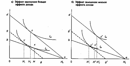 При повышении ставки заработной платы обычно действуют оба эффекта. Увеличение совокупных доходов вызывает действие эффекта дохода и ведет к сокращению количества часов работы, повышение ставки заработной платы вызывает действие эффекта замещения и ведет к увеличению количества часов работы. Эффекты действуют разнонаправленно, и их совокупное воздействие на предложение труда будет зависеть от абсолютной величины каждого из эффектов. На рис. 1.6 изображено различное воздействие увеличения ставки заработной платы с 0b/0а до 0d/0a на предложение труда индивидуумов А и В. На рис. 1.6а доминирует эффект замещения, поэтому совокупное воздействие обоих эффектов приводит к увеличению часов работы, на рис. 1.6б доминирует эффект дохода, поэтому в итоге количество часов работы сокращается. Чтобы выявить чистый эффект замещения, необходимо устранить действие эффекта дохода, т. е. установить, сколько часов предпочел бы работать индивидуум при новой цене досуга (ставке заработной платы), но при старом уровне полезности. Для этого изображается условная линия бюджетных ограничений, параллельная новому ограничению ad и касательная к старой кривой безразличия; (gg является касательной к IА1, g’g’ — касательной к IВ1 для индивидуумов А и В соответственно. При данных ограничениях индивидуумы А и В предпочтут оптимизировать соотношение труд—досуг соответственно в точках у и у’. При чистом эффекте замещения оба индивидуума увеличат предложение труда: А — с H0Н до H0Н1, В — с H0Н’до H0Н1’. Эффект дохода зависит от расположения различных кривых безразличия. На рис. 1.6а и 1.66 эффект дохода отрицателен, т. е. досуг и товары являются нормальными благами, и рост совокупного дохода вследствие изменения ставки заработной платы вызывает увеличение потребления досуга на величину, соответствующую отрезку H1Н2 для индивидуума А и H1Н2 и H’0Н’1 для индивидуума В. Необходимо сравнить относительные величины двух эффектов для каждого индивидуума. Для индивидуума А абсолютная величина отрицательного эффекта дохода H1Н2 меньше величины эффекта замещения HН1. Для индивидуума В величина эффекта замещения H’Н’1 меньше абсолютной величины эффекта дохода H’1Н’2 .