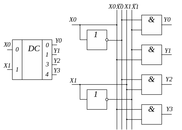 Рис. Условное графическое обозначение дешифратора (а) и схема его реализации (б)