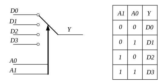 Рассмотрим функционирование четырехвходового мультиплексора (4→1), который условно изображен в виде коммутатора рис.,а, а состояние его входов D1, D2, D3, D4 и выхода Y приведено на рис. б. Исходя из таблицы, можно записать следующее уравнение: