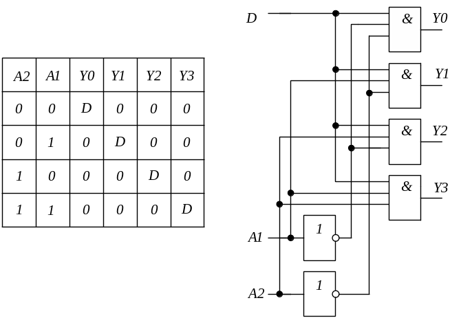 Рис.. Таблица состояний демультиплексора (а) и его реализация на логических элементах (б)