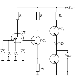 Схема на диодах. Схема ТТЛ-элемента с простым инвертором, выполняющая логическую операцию И-НЕ. если на один из входов или на оба входа подать низкий уровень напр-я, то ток базы тр-ра VT2 будет равен 0, и на коллекторе тр-ра VT2 будет высокий уровень напр-я. Если на оба входа подать высокий уровень напр-я, то через базу VT2 тр-ра будет протекать большой базовый ток и на коллекторе тр-ра VT2 будет низкий уровень напр-я, т. е. данный элемент реализует функцию И-НЕ.  |