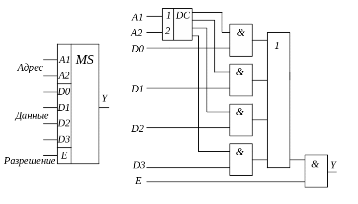 Схематически мультиплексор можно изобразить в виде коммутатора, обеспечивающего подключение одного из нескольких входов (их называют информационными) к одному выходу устройства.
