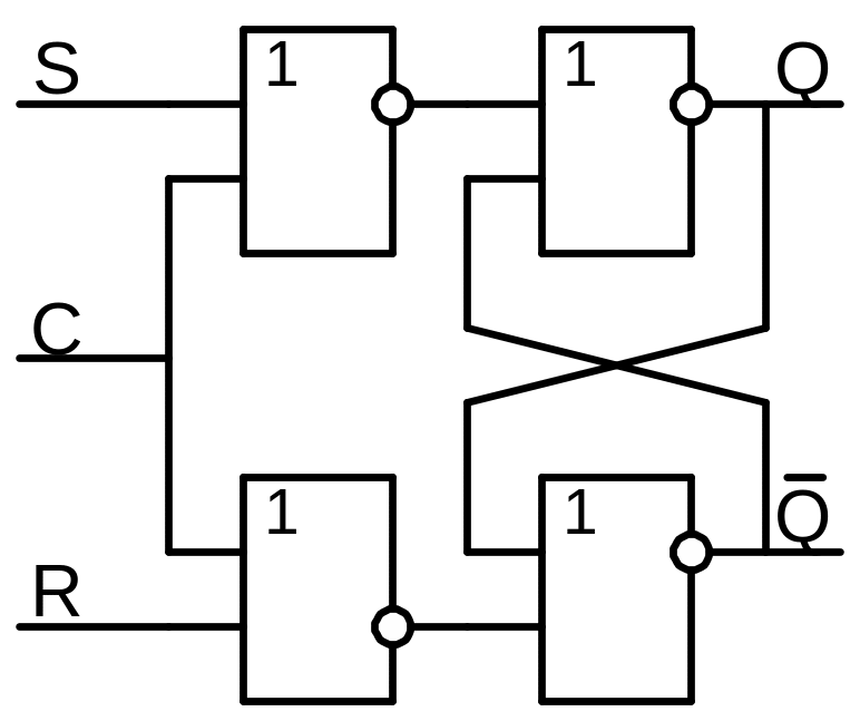 Синхронный RS-триггер.Если на входе С –«0», то и на выходе верхнего вх. эл-та «И-НЕ», и на вых. нижнего будет «1». (это обесп-ет хранение информации).Если на вх. С –«0», то возд-ие на входы R, S не приводит к изм-ию сост-ия триггера. Если же на вход синхр-ии С подана «1», то схема реагирует на вх. сигналы.