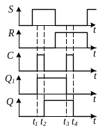 По способу приема инф-ии разл-ют асинхронные и синхронные триггеры. Асинхронный триггер изм-ет свое сост-ие непосредственно в момент появления соответ-го инфор-ого сигнала. Синхронные триггеры реаг-ют на инф-ые сигналы только при наличии соответ-го сигнала вх. синхр-ии С.