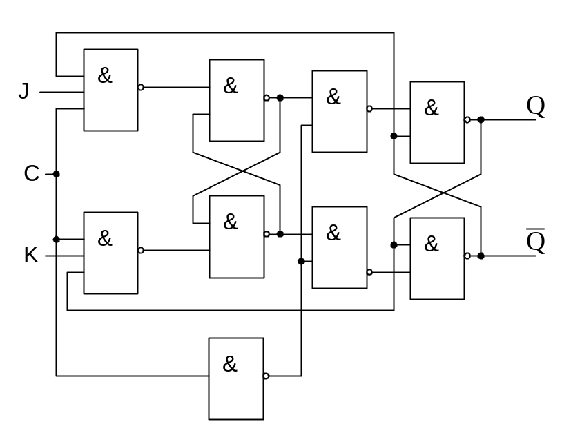 JK-триггер при комбинациях входных сигналов J=K=0, J=0 и K=1, J=1 и K=0 он работает, как RS-триггер (вход J соответствует входу S, a K - R), а при J=K=1 изменяет свое состояние на противоположное, т.е. работает как счетный триггер.
