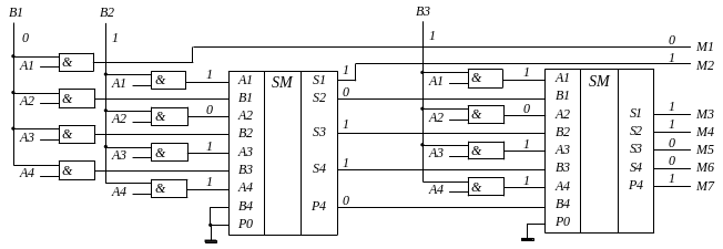 На рис. 22.11 показана схема для перемножения двух двоичных чисел: четырехразрядного A = A4A3A2A1 и трехразрядного B = B3B2B1.