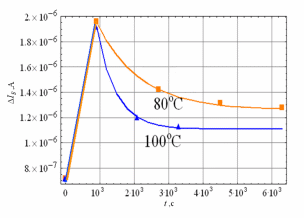 Зависимости деградации тока базы от времени на этапе послерадиационного отжиг при 80ºC и 100ºC представлены на рис. 4. Эти зависимости типичны для исследуемых NPN и PNP транзисторов и входных токов транзисторов операционных усилителей.
