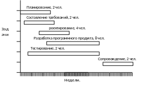 Составление временного графика проекта начинают с построения GANTT-диаграммы этапов разработки, пример которой приведен на рисунке 25. При планировании небольших проектов это легко делать вручную. На диаграмме, получившей такое название по имени автора — Генри Ганта (Henry Gantt), хорошо видны очередность и взаимосвязь этапов, их последовательность во времени, конечный срок завершения проекта.