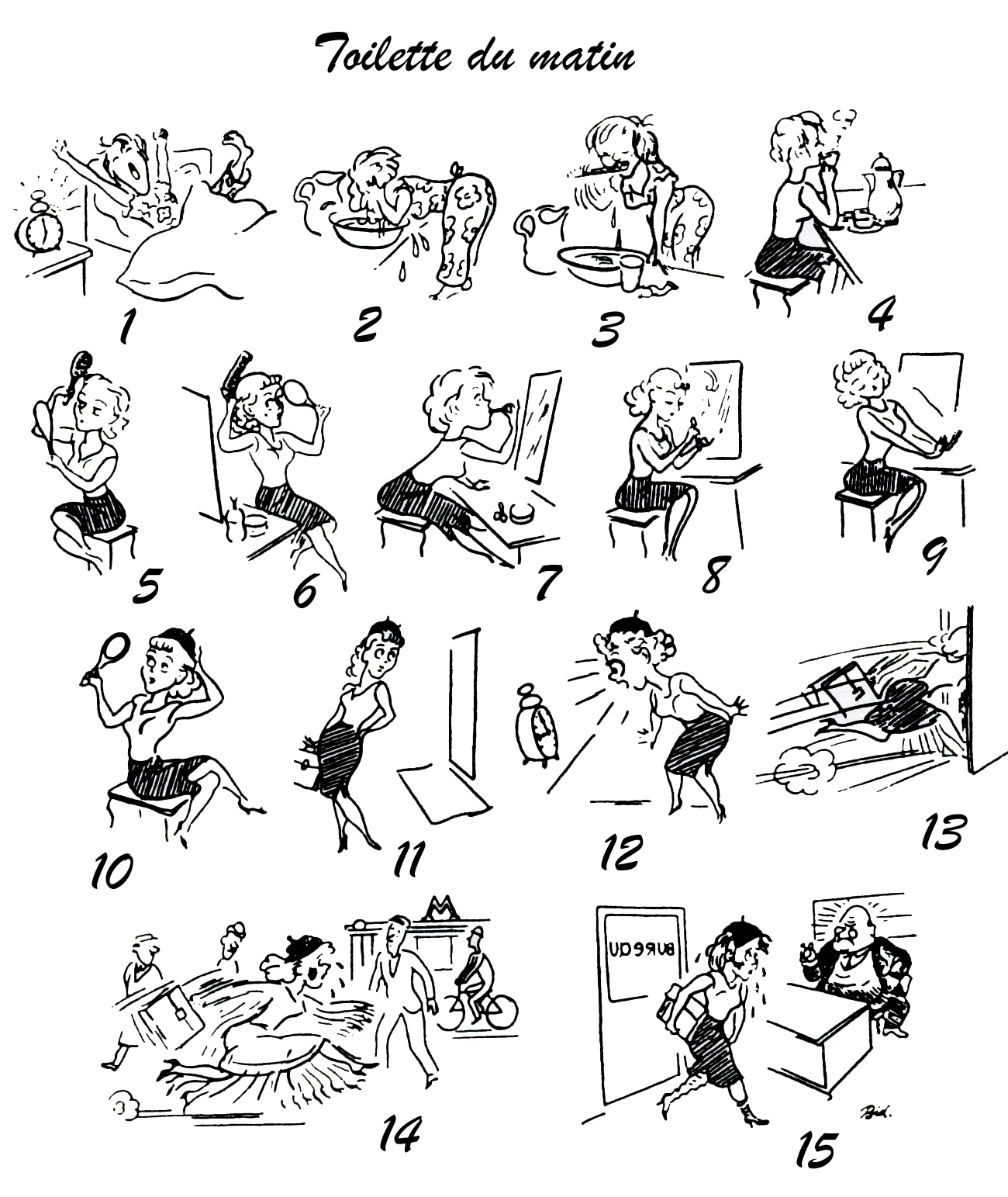 Dans la famille de Laurence, la grand-mère se lève de bon matin. Mais elle ne réveille jamais sa petite fille. La grand-mère commence à préparer le petit déjeuner. Laurence et ses parents dorment encore. Le réveil ne sonne pas, mais la fille se réveille toute seule. Elle reste encore un peu au lit et puis saute. Elle fait sa gymnastique et sa toilette. Elle se brosse les dents, se lave à l’eau froide et avec du savon, puis elle s’essuie avec sa serviette de toilette, elle s’habille et se peigne devant la glace. Si elle ne se dépêche pas, elle n’oublie pas de se doucher. Les parents se lèvent un peu plus tard : la mère se lève à 6 h. et demie ; quant à son père, il se lève à 6 h. car il se rase longtemps. On déjeune à 8 h. La grand-mère s’adresse à Laurence : « Regarde-toi dans la glace ! » Laurence quitte la maison la première.