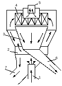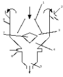 Воздух с исходным материалом по патрубку 1 поступает в полость между корпусами 2 и 3, за счет внезапного расширения, крупные частицы выпадая из взвесенесущего потока через патрубок 7 отводятся на помол, поток по направляющим лопаткам 4 поступает во внутренний корпус 3 где закручивается, регулируя угол поворота лопаток меняют направление и скорость потока изменяя тем самым границы разделения частиц; мелкие частицы выпадая из потока выводятся по патрубку 6 в готовый продукт, а воздух со взвешенной пылью направляется по патрубку 5 – в пылеосадительное устройство, а оттуда – в готовый продукт.