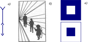 иллюзия иррадиации, т.е. кажущееся увеличение размеров светлых предметов по сравнению с темными (рис. в).