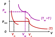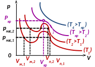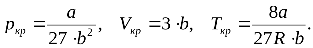 Теоретические изотермы Ван-дер-Ваальса в целом удовлетворяют экспериментально полученным изотермам Эндрюса (рис.), кроме физически невозможных участков, на которых одновременно при сжатии вещества падаем давление. Критические параметры определяются по формулам: