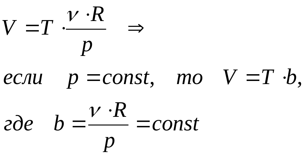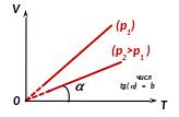 Зависимость V(T) на плоскости (V,T) изображается прямой, которая называется изобарой, выходит из начала координат и имеет тангенс угла наклона (рис.).