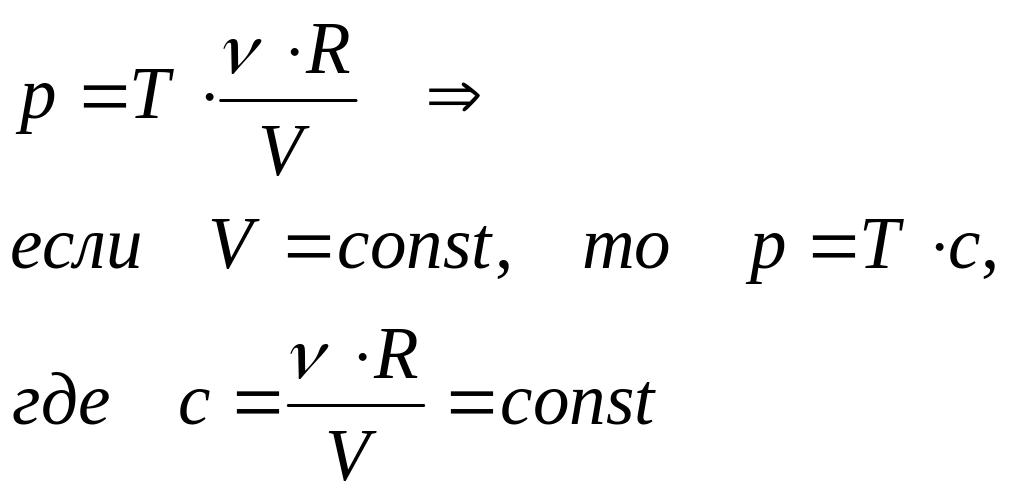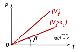 Зависимость p(T) на плоскости (p,T) изображается прямой, которая называется изохорой, выходит из начала координат и имеет тангенс угла наклона (рис.):