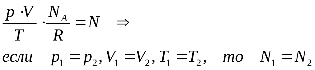 1. Закон Авогадро: если давления, объемы и температуры газов одинаковые, то газы содержат одинаковое число молекул