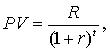 где PV – текущая стоимость; R – ожидаемый в будущем доход; r – ставка дисконтирования (ставка ссудного процента); t – период времени.