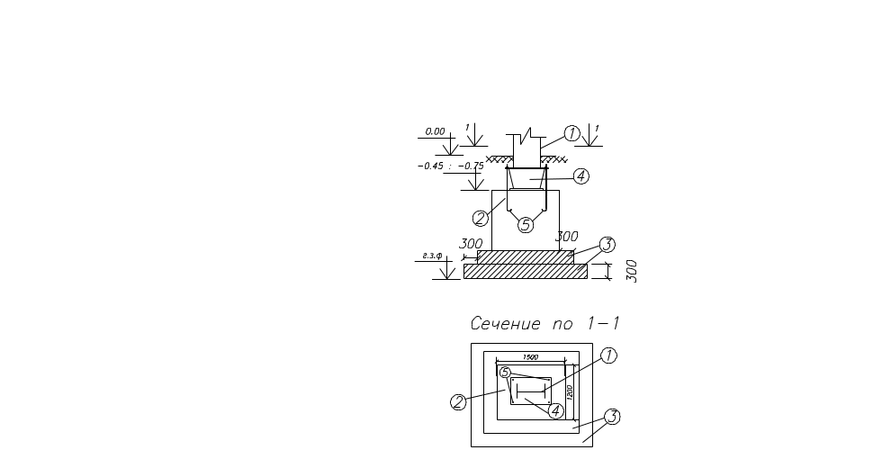 Рис.2. Проектирование фундамента столбчатого типа под стальную колонну. 1- сечение колонны каркаса; 2- столбчатый фундамент под колонну; 3 – фундаментные подушки (плиты) под столб фундамента;4 – траверса колонны; 5 – анкерные болты крепления траверсы колонны; г.з.ф.- глубина заложения фундамента; г.з.т.(-0.45 : -0.75)- глубина заделки траверсы;
