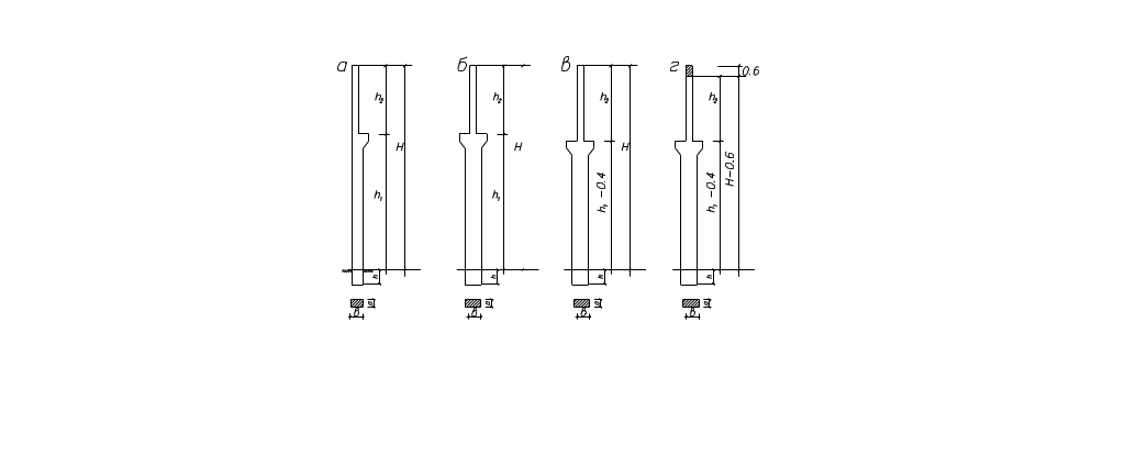 Рис. 7. а – колонны крайнего ряда; б - колонны среднего ряда; Н – высота цеха (колонны) от пола до низа несущих конструкций покрытия; Н-0.6 – высота колонны при подстропильных конструкциях; h – глубина заделки колонны в фундамент; a и b –сечение колонн.
