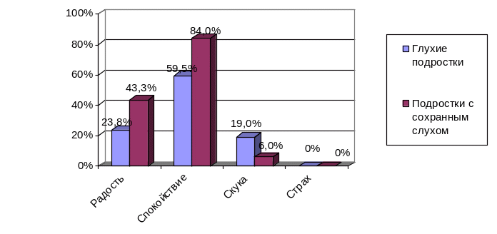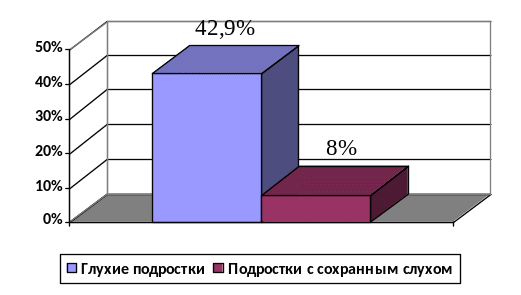 Экспериментальное исследование носило сравнительный характер и проводилось на базе двух школ г. Кирова: ГС(К)ОУ для обучающихся, воспитанников с ограниченными возможностями здоровья «Кировской специальной (коррекционной) общеобразовательной школы-интерната I вида» и МОУ СОШ с УИОП № 60. В исследовании приняли участие 32 подростка в возрасте 14-15 лет, из них 7 учащихся с нарушенным слухом (один класс школы-интерната) и 25 учащихся с сохранным слухом (один класс общеобразовательной школы). Процентное соотношение респондентов по половому признаку в обеих группах было следующим: