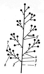 Рис. 13.15. Строение соцветия : 1 – главная ось, 2 – боковая ось (паракладий), 3 – узлы, 4 – междоузлия, 5 – прицветники, 6 – цветоножки, 7 – цветки.