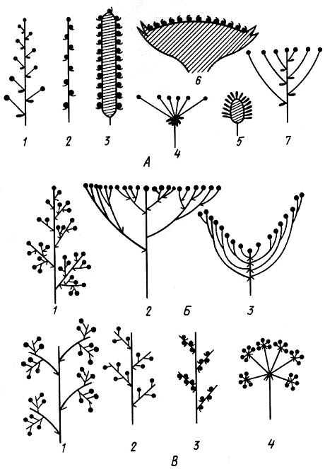 Рис. 13.16. Типы ботриоидных соцветий . А – простые ботриоидные: 1 – кисть, 2 – колос, 3 – початок, 4 – простои зонтик, 5 – головка, 6 – корзинка, 7 – щиток (4. 5, 6 – с укороченной главной осью, прочие – с удлиненной); Б – сложные ботриоидные. Метелка и ее производные:1 – метелка, 2 – сложный щиток, 3 – антела; В – сложные ботриоидные. Сложная кисть и ее производные: 1– тройная кисть, 2 – двойная кисть, 3 – двойной колос, 4 – двойной зонтик