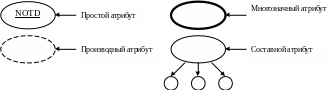 Производный атрибут – атрибут, который представлен значением производным от связного с ним атрибута. Пример: Возраст сотрудника -> Дата рождения.
