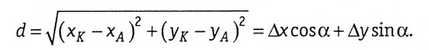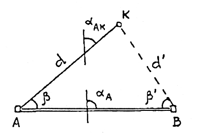 Этот способ широко применяется при разбивке зданий, сооружений и конструкций с пунктов полигонометрических и теодолитных ходов при малом расстоянии между исходными и выносимыми пунктами. Положение точки К на местности определяют путем откладывания от твердой линии АВ угла β и по полученному направлению АК горизонтального проложения d. Угол β = αА - αAK, где αА, αАК — дирекционные углы линий АВ и АК соответственно.