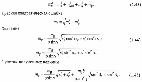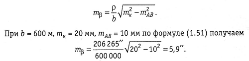 В формулах (1.44), (1.45) mβ — средняя квадратическая ошибка откладывания углов β1, β2. Для приближения расчетов, принимая s1 ≈ s2 = s, вместо (1.46) имеем