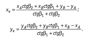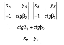 Для определения выносимой точки К с повышенной точностью после определения точки К на местности на пунктах А и В соответствующим числом приемов измеряют углы β1, β2. Измеряют также угол γ на точке К. Распределив невязку в треугольнике поровну на все три угла, вычисляют хк, ук по формулам котангенсов (Юнга):