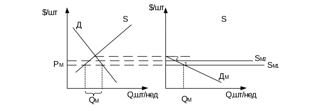 Украина (в нашем случае страна-монопсония по «салу») имеет возможность воздействовать на рыночные цены. Иностранцы рассуждают так: если в Украине высокие цены на сало, то можно произвести и предложить к продаже большое количество сала, возможно даже в ущерб производству других . альтернативных товаров. Если цены падают, то иностранный бизнес пересматривает структуру своего товарного портфеля, уменьшая объем производства сала, перебрасывая капитал на производство других более рентабельных товаров. Этим и объясняется возрастающий характер функции SM.