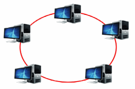«Кольцо» — это топология, в которой каждый компьютер соединен линиями связи только с двумя другими (рис.5) : от одного он только получает информацию, а другому только передает. На каждой линии связи, как и в случае звезды, работает только один передатчик и один приемник. Это позволяет отказаться от применения внешних терминаторов. Важная особенность кольца состоит в том, что каждый компьютер ретранслирует (восстанавливает) приходящий к нему сигнал, то есть выступает в роли репитера, поэтому затухание сигнала во всем кольце не имеет никакого значения, важно только затухание между соседними компьютерами кольца. Четко выделенного центра в данном случае нет, все компьютеры могут быть одинаковыми. Однако довольно часто в кольце выделяется специальный абонент, который управляет обменом или контролирует обмен. Понятно, что наличие такого управляющего абонента снижает надежность сети, так как выход его из строя сразу же парализует весь обмен.Строго говоря, компьютеры в кольце не являются полностью равноправными (в отличие, например, от шинной топологии). Одни из них обязательно получают информацию от компьютера, ведущего передачу в данный момент, раньше, а другие - позже. Именно на этой особенности топологии и строятся методы управления обменом по сети, специально рассчитанные на «кольцо». В этих методах право на следующую передачу (или, как еще говорят, на захват сети) переходит последовательно к следующему по кругу компьютеру.Подключение новых абонентов в «кольцо» обычно совершенно безболезненно, хотя и требует обязательной остановки работы всей сети на время подключения. Как и в случае топологии «шина», максимальное количество абонентов в кольце может быть довольно велико (до тысячи и больше). Кольцевая топология обычно является самой устойчивой к перегрузкам, она обеспечивает уверенную работу с самыми большими потоками передаваемой по сети информации, так как в ней, как правило, нет конфликтов (в отличие от шины), а также отсутствует центральный абонент (в отличие от звезды).Так как сигнал в кольце проходит через все компьютеры сети, выход из строя хотя бы одного из них (или же его сетевого оборудования) нарушает работу всей сети в целом. Точно так же любой обрыв или короткое замыкание в любом из кабелей кольца делает работу всей сети невозможной. Кольцо наиболее уязвимо к повреждениям кабеля, поэтому в этой топологии обычно предусматривают прокладку двух (или более) параллельных линий связи, одна из которых находится в резерве.В то же время крупное преимущество кольца состоит в том, что ретрансляция сигналов каждым абонентом позволяет существенно увеличить размеры всей сети в целом (порой до нескольких десятков километров). Кольцо в этом отношении существенно превосходит любые другие топологии.Недостатком кольца (по сравнению со звездой) можно считать то, что к каждому компьютеру сети необходимо подвести два кабеля.Иногда топология «кольцо» выполняется на основе двух кольцевых линий связи, передающих информацию в противоположных направлениях. Цель подобного решения — увеличение (в идеале - вдвое) скорости передачи информации. К тому же при повреждении одного из кабелей сеть может работать с другим кабелем (правда, предельная скорость уменьшится).