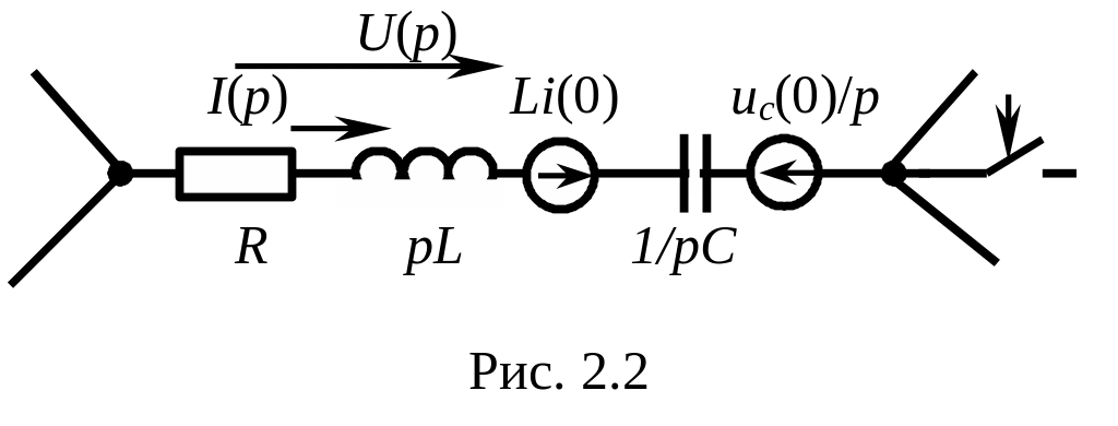Такие же выражения можно получить, если изобразить схему (рис. 2.1) с добавлением дополнительных источников, учитывающих начальные условия, и ввести обозначения в операторной форме (рис. 2.2). В результате получается операторная схема, эквивалентная классической.