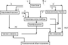 Рис.1. Блок – схема автоматизированного технологического комплекса: 0 – отчет; 3 – задание; И – информация; РУ – ручное управление; ЛРУ – управление при помощи локальных регуляторов; НЦУ – непосредственное цифровое управление.
