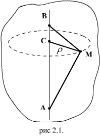 Если в процессе движения абсолютно твердого тела (рис.2.1) его точки А и В остаются неподвижными, то и любая точка С тела, находящаяся на прямой АВ, также должна оставаться неподвижной. В противном случае расстояния АС и ВС должны были бы изменяться, что противоречило бы предположению об абсолютной твердости тела. Поэтому движение твердого тела, при котором две его точки Аи В остаются неподвижными, называют вращением тела вокруг неподвижной оси, а неподвижную прямую АВ называют осью вращения.
