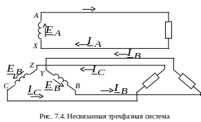 Впервые многофазные системы были применены П.Н. Яблочковым для питания изобретенных им электрических свечей. В его установках обмотки многофазных генераторов присоединялись к электрически не связанным друг с другом линиям, питавшим отдельные группы свечей. Подобные многофазные системы называются несвязанными. На рис. 7.4 показана несвязанная трехфазная система.