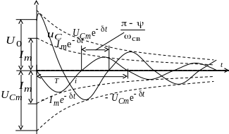 Кривая тока i подобна кривой Ri. Процесс в данном случае является колебательным. Ток и напряжение на всех участках периодически меняют знак. Амплитуда колебаний убывает по экспоненциальному закону, в цепи совершаются затухающие колебания. Угловая частота этих колебаний