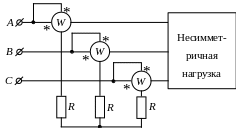 В этом случае следует учитывать, что в состав сопротивления должно входить сопротивление обмотки напряжения ваттметра. Иначе говоря, должно соблюдаться равенство R1 + RВ = R. Общая мощность будет равна утроенной мощности, измеряемой одним ваттметром.