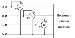 Измерение мощности в несимметричных трехфазных цепях может быть выполнено двумя методами в зависимости от наличия или отсутствия нулевого провода.