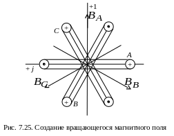 В общем случае для создания вращающегося поля (кругового или эллиптического) необходимо и достаточно иметь пространственный сдвиг катушек и временной сдвиг токов, протекающих в них.