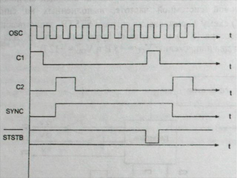 Частота входного сигнала генератора OSC равна резонансной частоте кварцевого резонатора. Делением чстоты сигнала OSC на 9 формируюься сигналы CLK1, CLK2 двухфазной синхронизации процессора. С помощью двух повторителей уровень сигналов