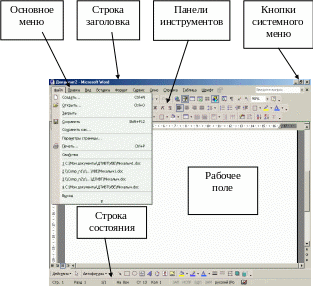 Строку заголовка, строку состояния, строку меню, стандартную панель инструментов, панель инструментов форматирования, линейки прокрутки, кнопки переключения вида документа, рабочую область.