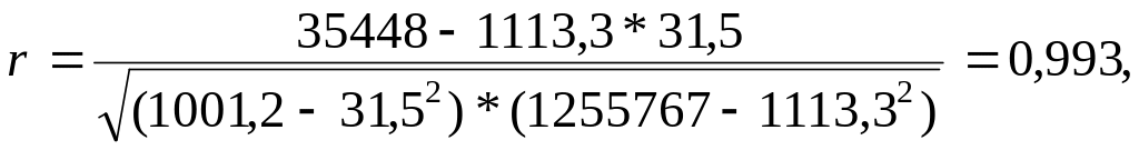 Рассчитаем линейный коэффициент корреляции по формуле (9.20):