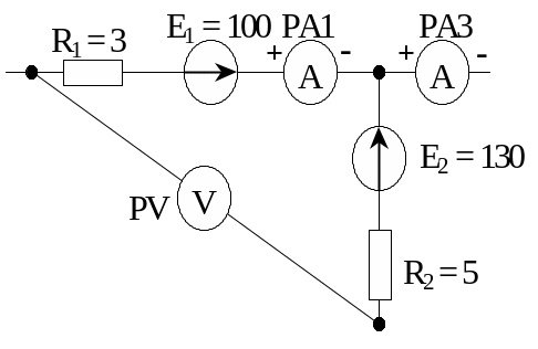 Для участка сложной цепи с заданными параметрами и показаниями приборов определить показание PV .