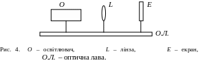 4.1. Наведену на нескінченність зорову трубу поставити з одного кінця оптичної лави (замість екрана), а освітлювач із предметом розташувати з іншої сторони лави. Між ними, поблизу освітлювача, поставити досліджувану збиральну лінзу.